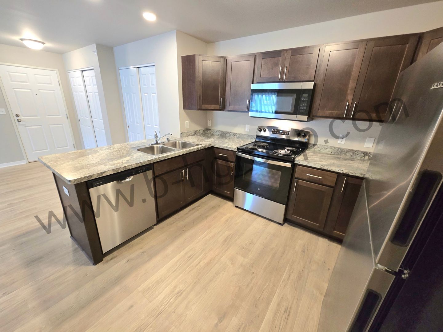 2 Bedroom 2 Bathroom Features: New construction apartments offer a combination of style and convenience. Key features include an open-concept layout with durable luxury vinyl plank flooring, a modern open-concept kitchen with stainless steel appliances and an island with breakfast bar perfect for entertaining or casual dining. For your convenience, the apartment comes with in-unit laundry facilities and central air to ensure a comfortable living environment. The primary bedroom has a walk-thru closet to the private bathroom. Residents can enjoy private outdoor spaces (balcony/patio). 1 assigned parking space included. All units are equipped with AT&T Fiber internet, ready to support all your digital needs. For your peace of mind, the property is equipped with a surveillance system and fire alarm and sprinkler system.